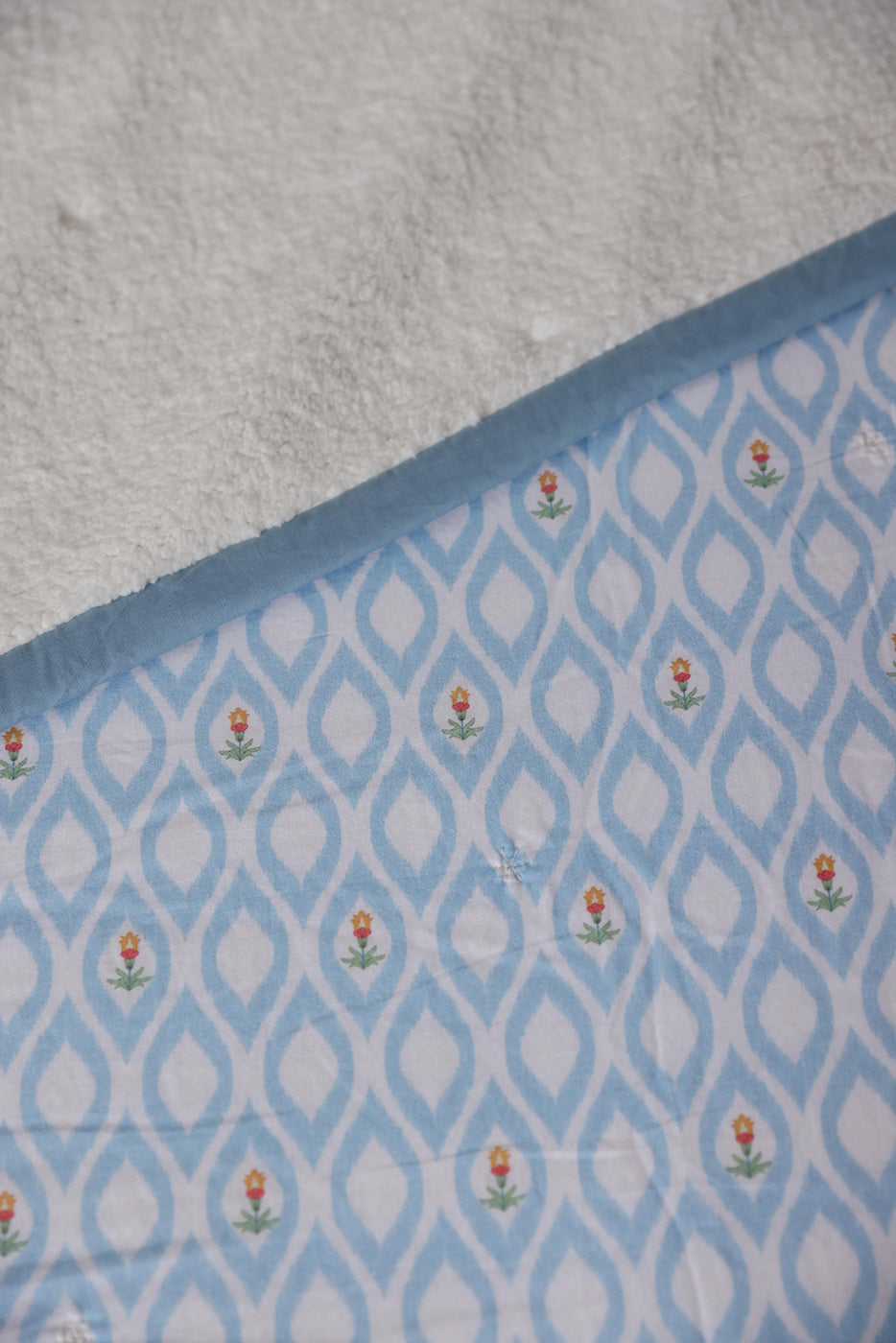 A modern take on the traditional dohars. The Printed fine muslin cloth on one side and soft sherpa on the back is held together with a small flower motif embroidery scattered all over the blanket.
