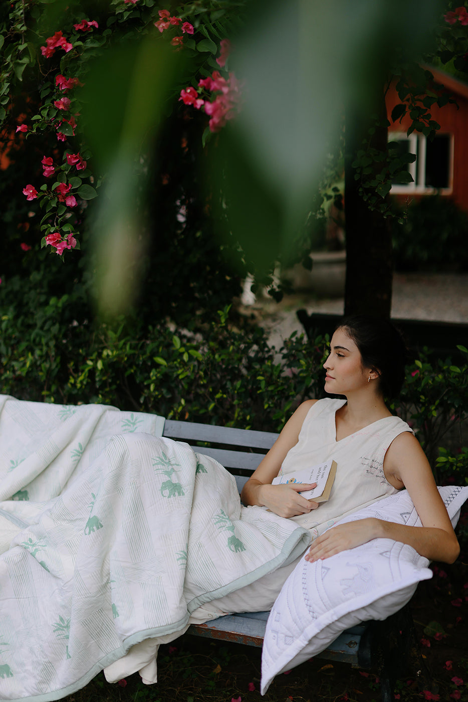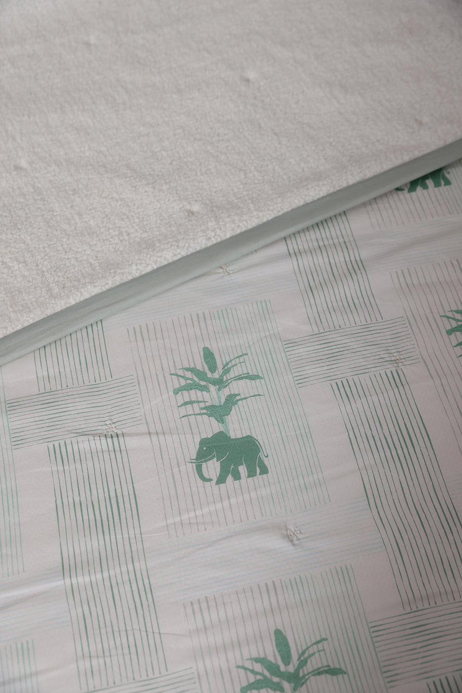 A modern take on the traditional dohars. The Printed fine muslin cloth on one side and soft sherpa on the back is held together with a small flower motif embroidery scattered all over the blanket.