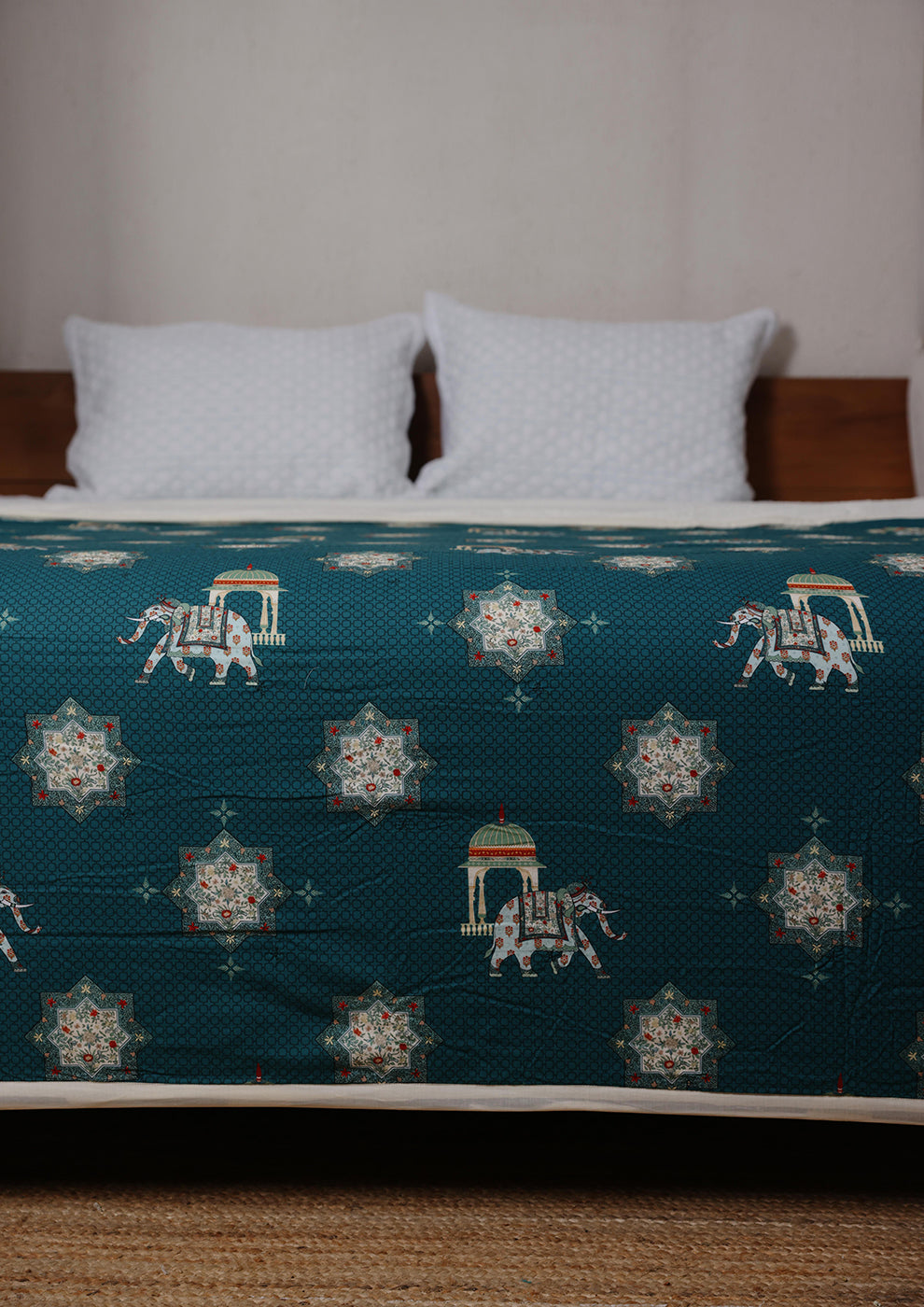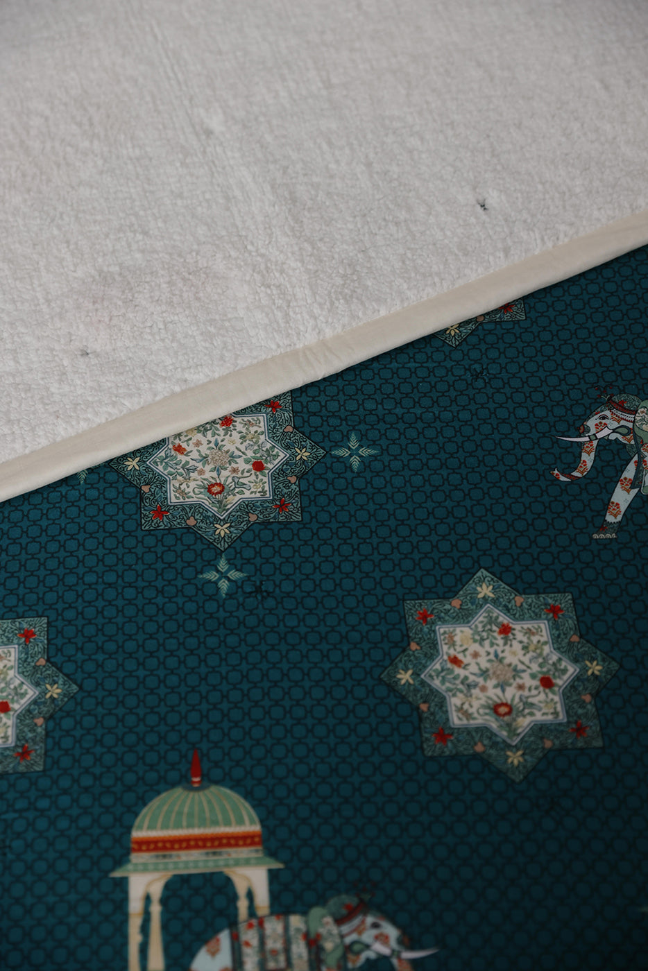 A modern take on the traditional dohars. The Printed fine muslin cloth on one side and soft sherpa on the back is held together with a small flower motif embroidery scattered all over the blanket.