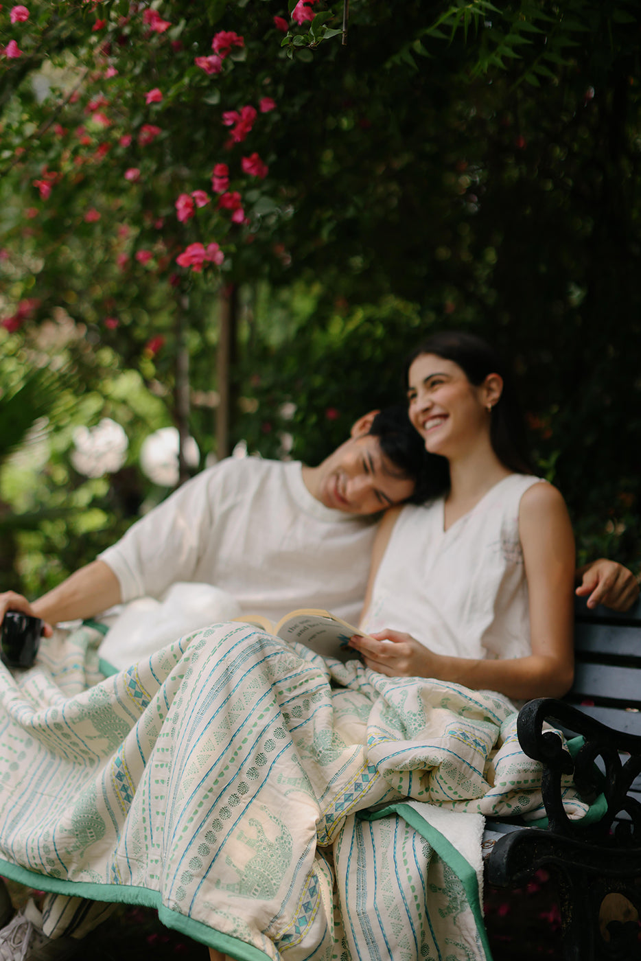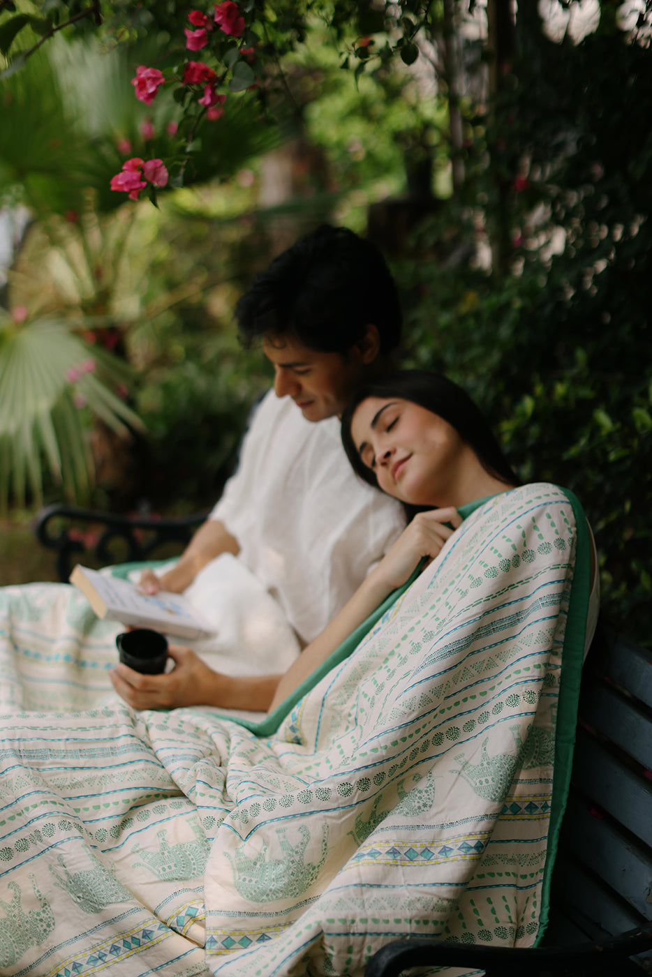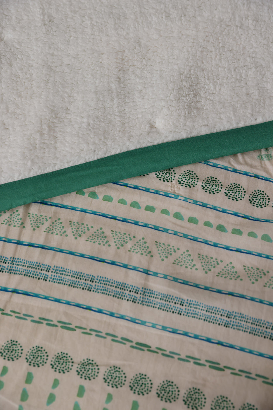 A modern take on the traditional dohars. The Printed fine muslin cloth on one side and soft sherpa on the back is held together with a small flower motif embroidery scattered all over the blanket.