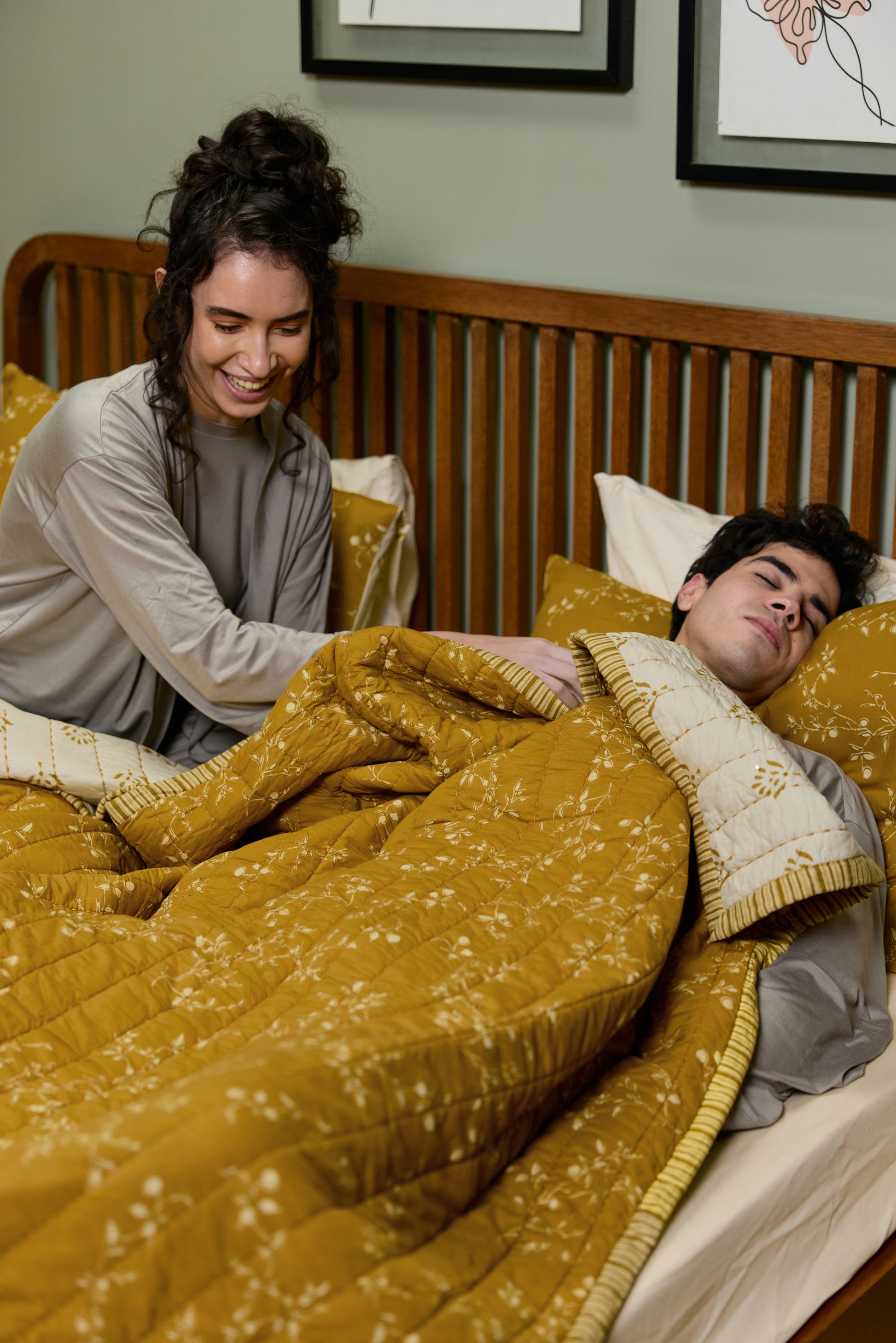 This reversible quilt is an all season quilt, made with the finest quality of cotton. The organic cotton filling makes it soft and fluffy, assuring you restful sleep through the night.